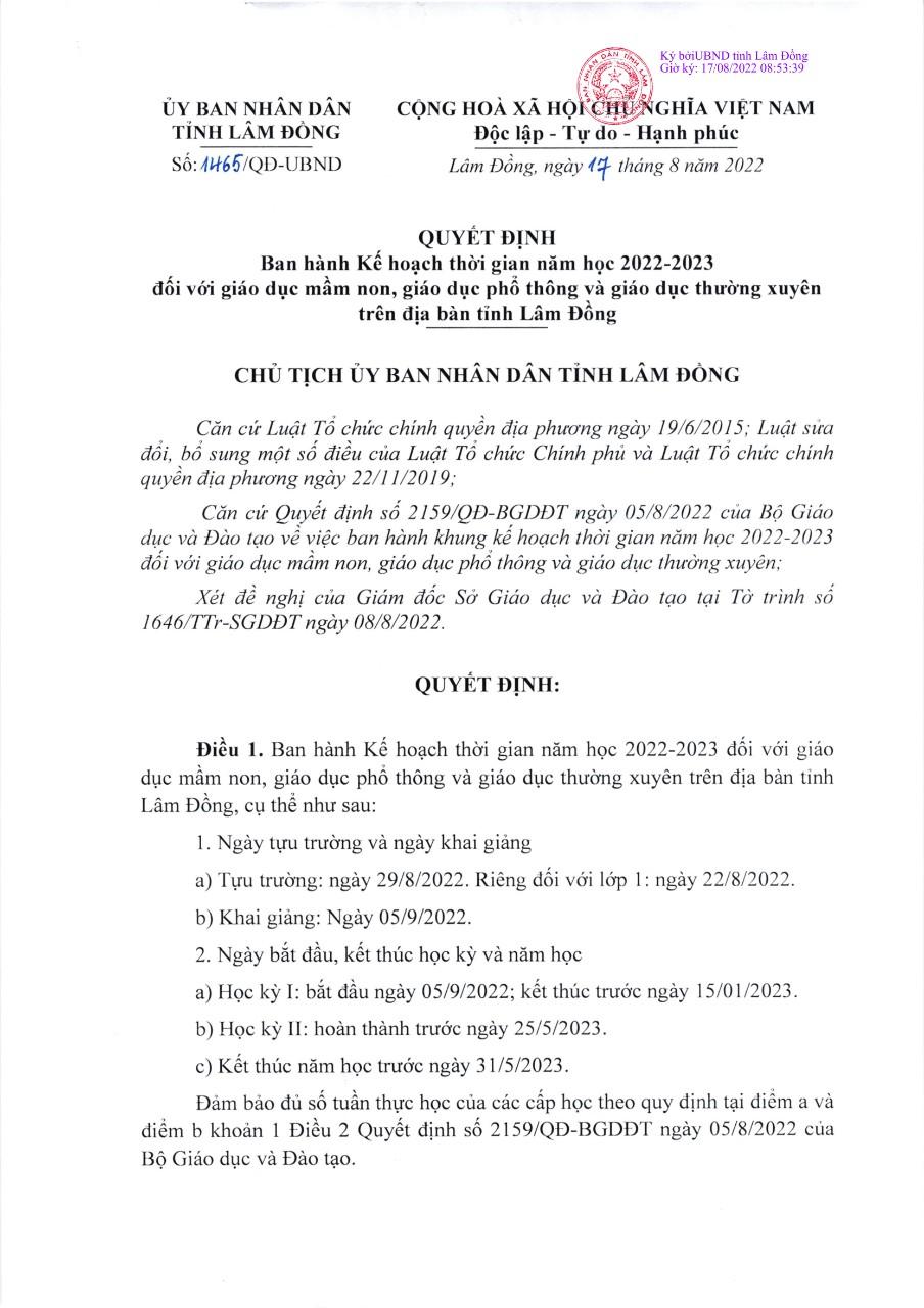 UBND tỉnh Lâm Đồng ban hành quyết định số 1465/QĐ-UBND ngày 17/08/2022 về việc ban hành Kế hoạch thời gian năm học 2022-2023 đối với giáo dục mầm non, giáo dục phổ thông và giáo dục thường xuyên trên địa bàn tỉnh Lâm Đồng